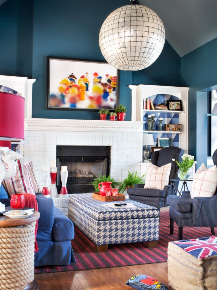 - Красный, синий, белый. Тёмно-синий и насыщенный красный, к которым нередко добавляют белые детали, — бодрое, яркое и очень респектабельное сочетание. В странах с англо-саксонскими традициями оно считается патриотическим, что можно отнести и к нам, поскольку это цвета и российского флага. В созвучии с массивным тёмным деревом триада обретает кабинетную солидность, а с белым в качестве основного цвета — вкус морского побережья.