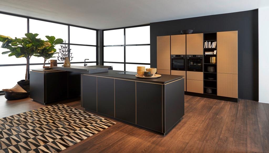 Даже если вы против радикальных решений и хотите, чтобы ваша кухня выглядела максимально традиционно, это не повод отказывать себе в стильной изюминке. Так, эти чёрные фасады таят в себе сюрприз — латунную окантовку. Она сделает строгую кухню более тёплой и уютной, а если добавить подсветку, этот эффект только усилится. Фасады отлично комбинируются с золотистыми, имитирующими кожаную фактуру.