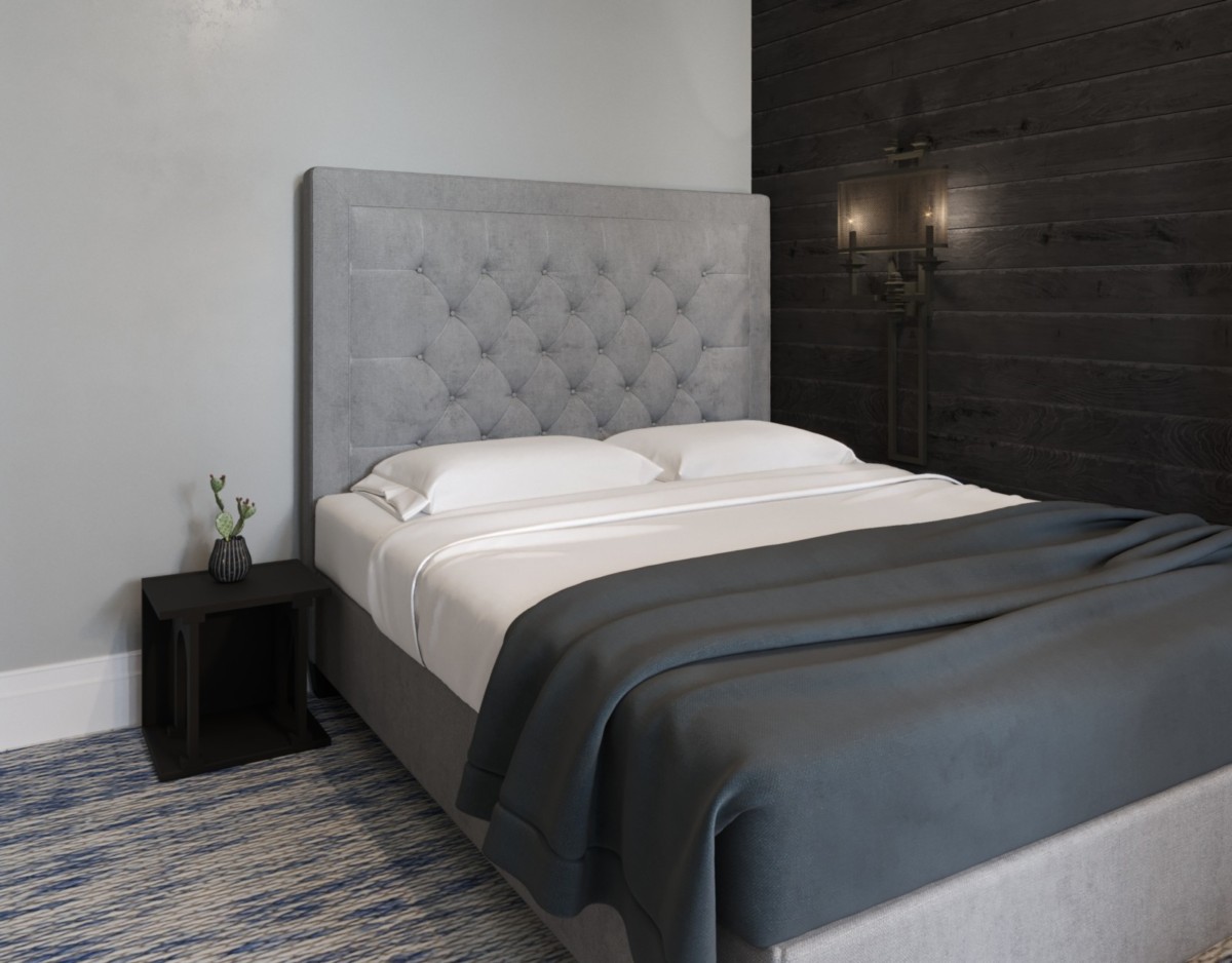 Интерьер этой спальни очень спокойный и благородный. Стена за кроватью выполнена в деревянной отделке чёрными досками, а остальное пространство покрыто светло-серой гладкой декоративной штукатуркой. Простые чёрные доски в сочетании с высоким изголовьем с каретной стяжкой создают сочетание простого и сложного — современного и классического. Акцентом и самой необычной деталью в обеих спальнях стало отсутствие штор — они заменяются деревянными ставнями.