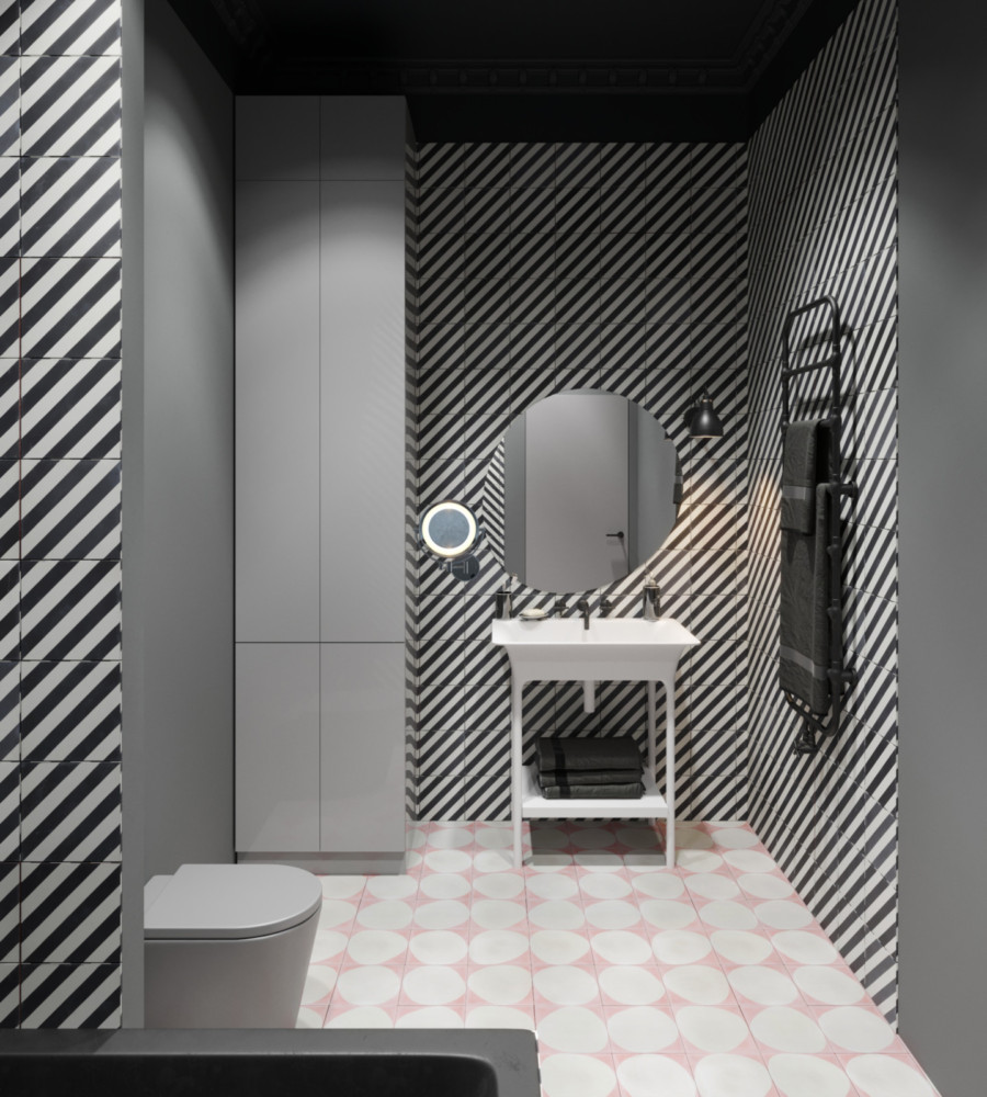 Санузел выполнен в очень современном ключе — графичная диагональная плитка создаёт ощущение динамики и чёткого ритма, который продолжается (но уже по-другому) в оформлении стены молдингами. Вся эта острота смягчается напольной плиткой и силуэтами окружностей нежного розового оттенка. Эти мягкие силуэты повторяются в форме зеркала над умывальником. Элемент классики здесь только на потолке — барочный объёмный карниз обрамляет всё это геометрическое великолепие, уводя его в абсолютно чёрный потолок.
