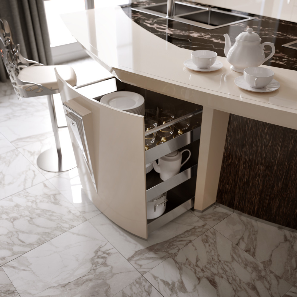 Все дверцы и ящики могут быть оснащены безручечной технологией и открываются лёгким нажатием. Каждая система хранения ориентируется на будущего хозяина. Тот же принцип касается внешнего оформления острова.